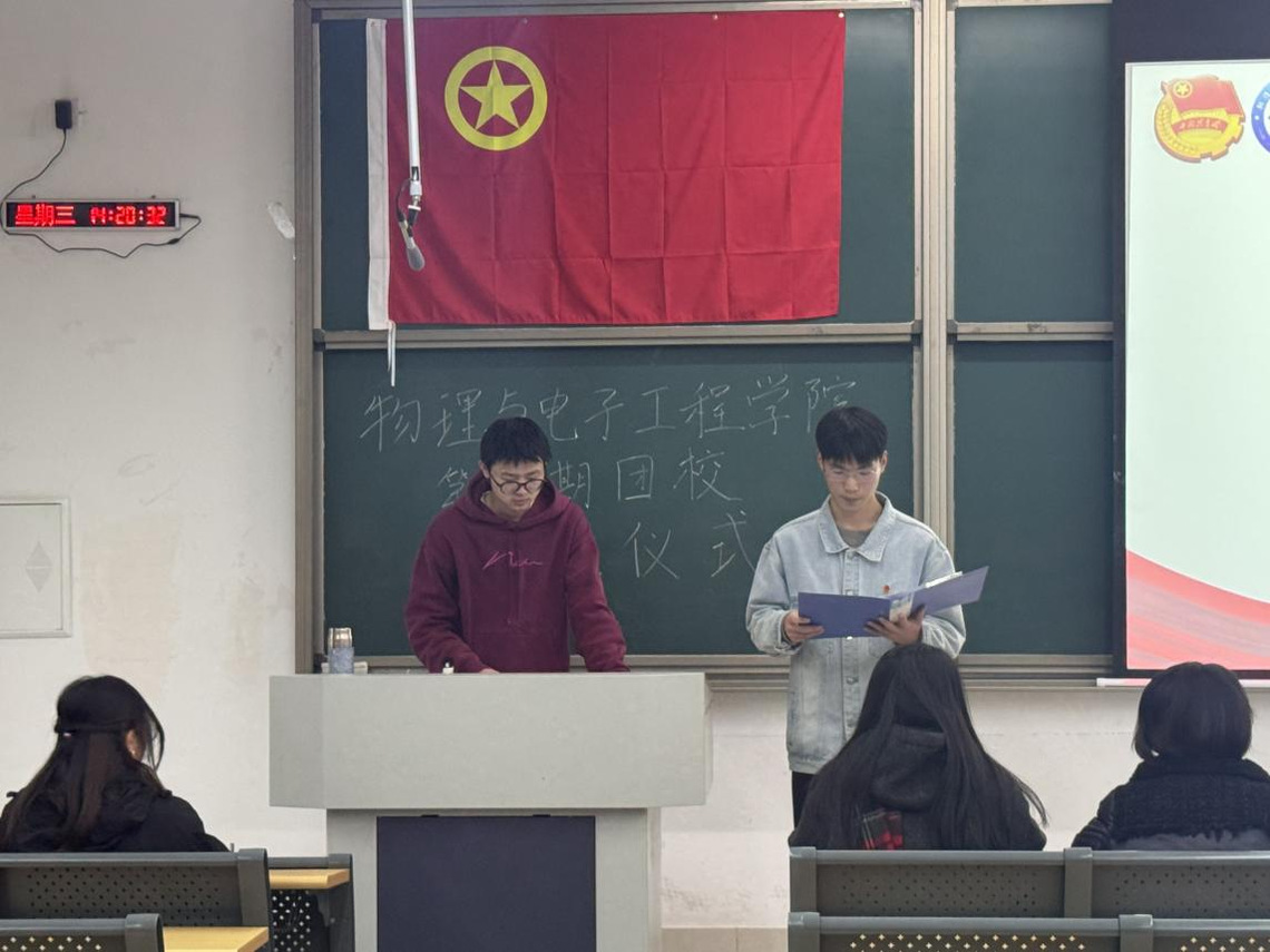仪式在庄严的国歌声中拉开帷幕。仪式现场,主持人宣读新团员名单,与会老师依次为新团员佩戴团徽。新团员面对团旗庄严宣誓,铿锵誓言既是对团组织的郑重承诺,也是新时代青年逐梦前行的信念表达。优秀团员代表杨雨露分享成长感悟,鼓励新团员以青春之我、奋斗之我,践行团员使命。新团员代表陈俊豪表态,将以团员标准严格自律,勤学笃行,不负期望。党员代表周文茜鼓励新团员以党员标准为标杆,在思想上求进步、在学业上求突破。