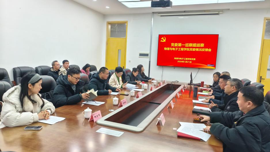 会上,侯懿代表巡察组向学院领导班子进行了巡察情况反馈。根据学校党委统一部署,第一巡察组于2025年10月至11月对物理与电子工程学院党委开展了常规巡察。侯懿指出,巡察组坚持以习近平新时代中国特色社会主义思想为指导,深入学习贯彻党中央、省委及学校党委关于巡视巡察工作的部署要求,坚守政治巡察定位,围绕“四个聚焦”监督重点,通过听取汇报、个别谈话、查阅资料、受理信访等方式,对学院党委进行了一次全面的“政治体检”。巡察组在反馈中肯定了学院党委近年来工作成效,同时指出了在党建引领业务发展、全面从严治党、班子群众工作能力、干部队伍建设、人才培养实效、推动内涵式高质量发展等方面存在的问题与差距。